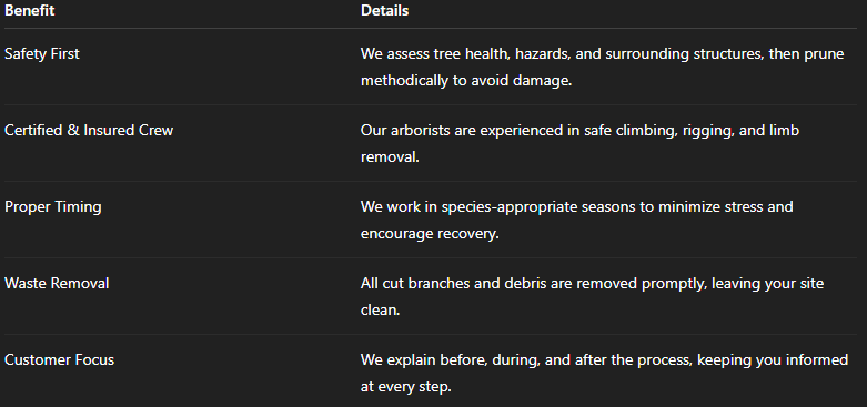 We inspect tree condition, species, structural issues, and your objectives (e.g. height reduction, view clearance, safety).